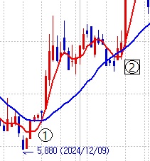 > 5일선과 20일선이 골든크로스하는데 직전 크로스업보다 높은 위치에서 크로스업하는 종목을 찾는 종목검색식을 부탁합니다. ②번과 같은 자리를 찾는 것입니다.